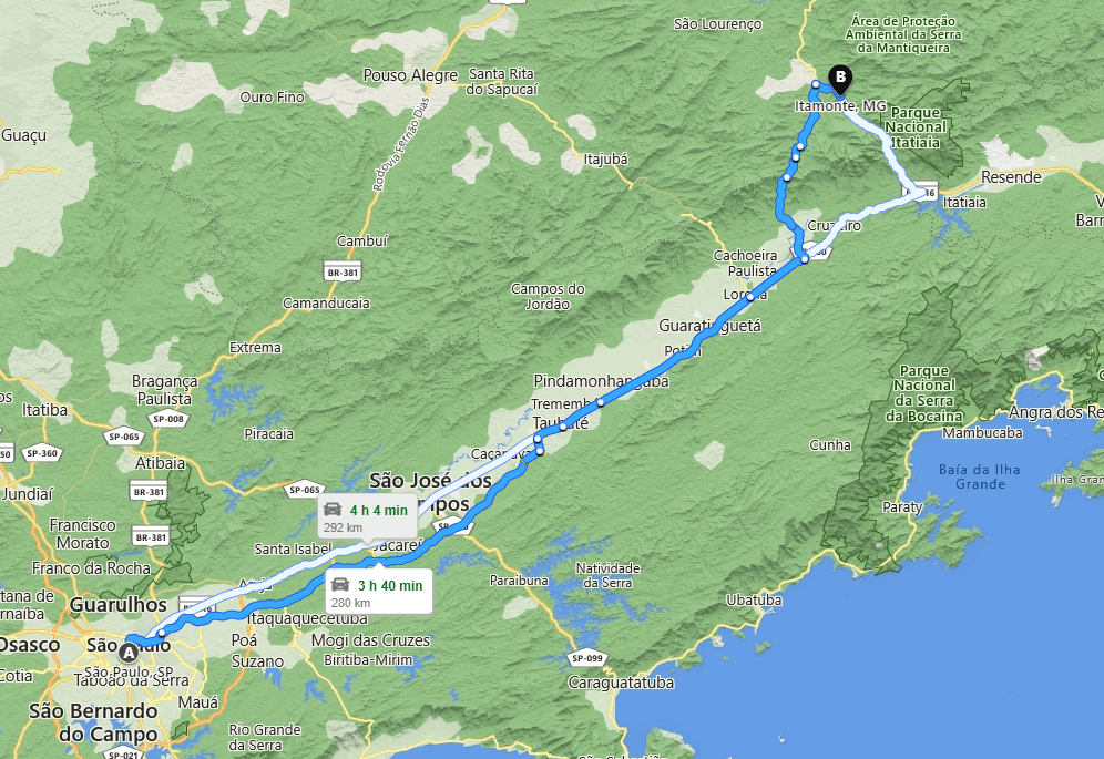 Mapa visual entre São Paulo e Itamonte
